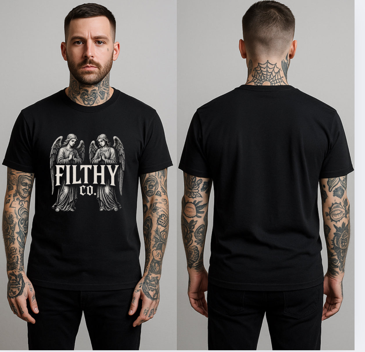 Front: Striking dual-angel artwork flanking the bold Filthy Co. gothic logo — symbolic of protection, rebellion, and faith in your own code.