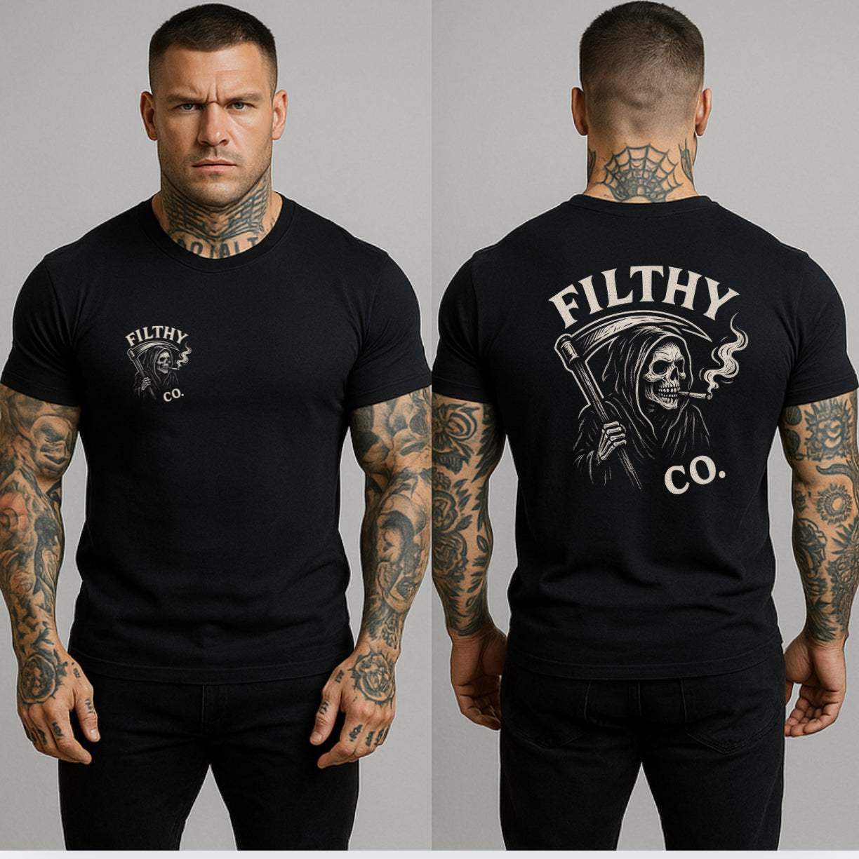 Death never looked this good. The Filthy Co. “Reaper” Tee is built for those who live fast, ride hard, and embrace the darker side of style. Featuring a clean chest print of the smoking reaper on the front and a full-size back graphic that demands attention, this piece captures everything Filthy Co. stands for — attitude, grit, and rebellion.